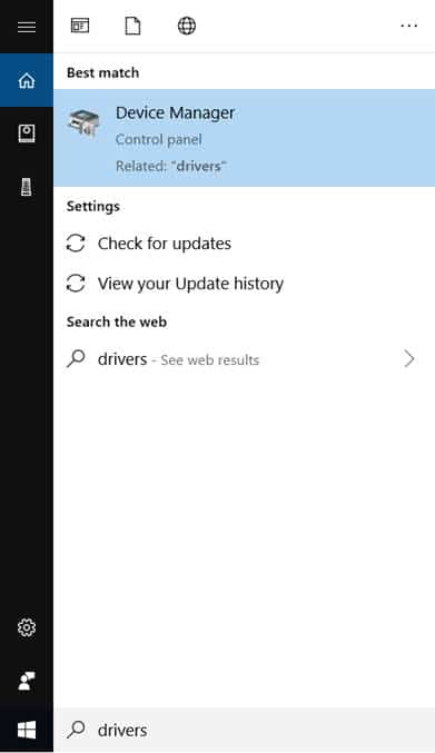 The easiest way to get to your Device Manager is simply to type “drivers” in the search bar and look for the highlighted option.