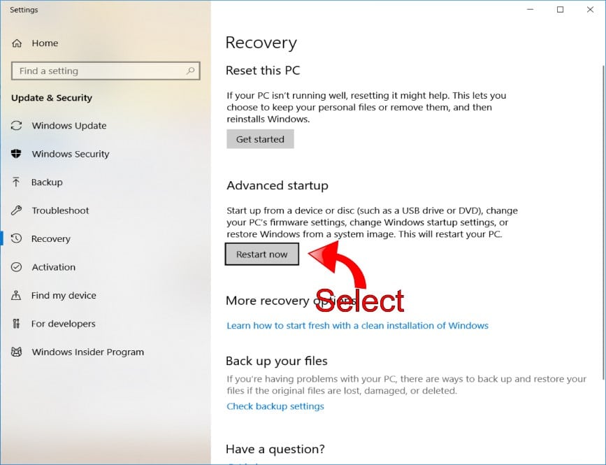 - Select Restart from the Advanced Startup section.