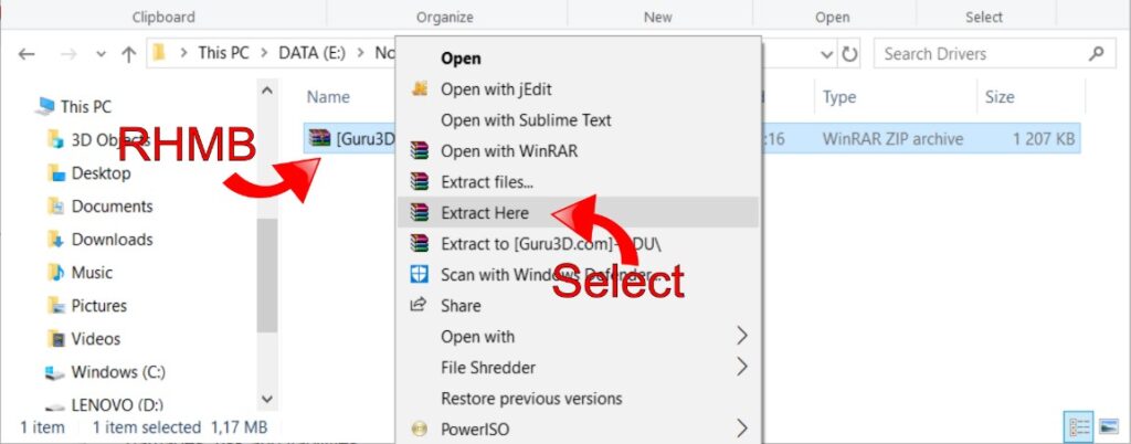 - You’ll need to unzip the package using an archiver tool by clicking on the download with the Right Hand Mouse Button (RHMB) and choosing Extract Here. Windows 10 comes with one included, but for older versions may need you to download and install Zip7 or WinZip.