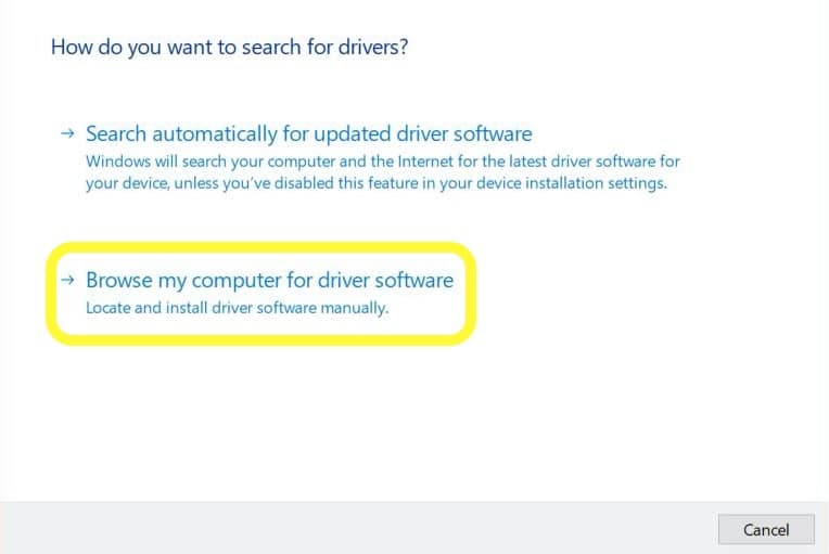 There will be two options. You can choose the first one to let Windows find the driver or just select the second one: “Browse my computer for driver software.” With the latter option, you can drill down to where you recently downloaded the driver and select it.