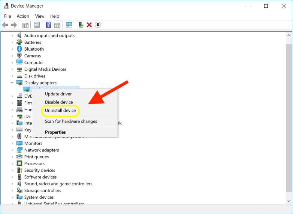 Once that’s completed, you can go into the Device Manager (by searching the same way) and determine if the video adapter’s driver is still installed. If so, right-click on it and choose Uninstall device.
