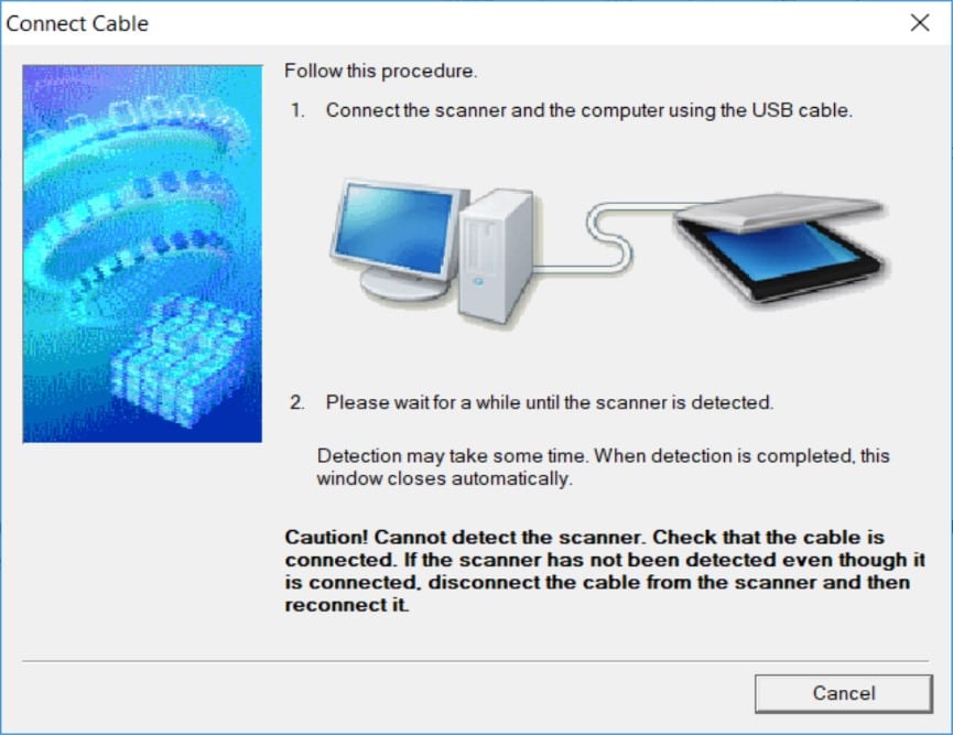 - After the software installs, you should connect your scanner via the USB cable to complete the process.