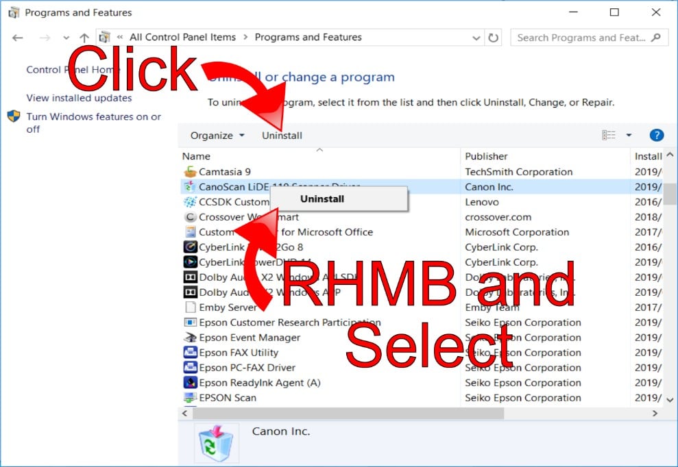 - From the list of Programs and Features, scroll down until you find the CanoScan LiDE 110 Scanner Driver application.