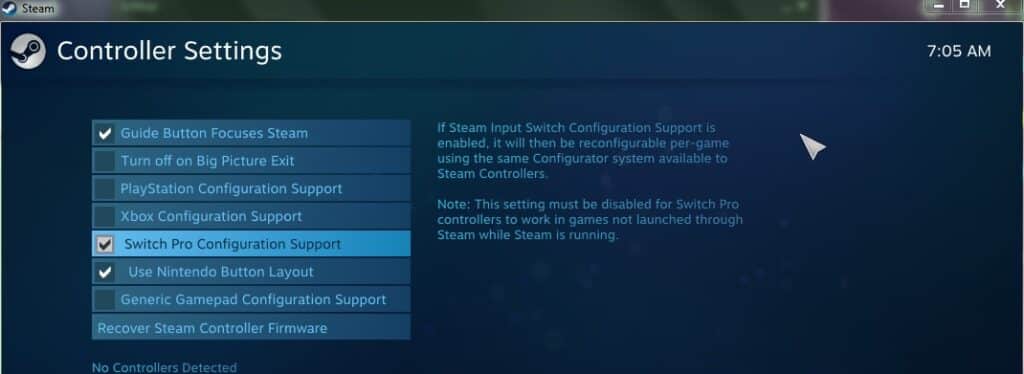 Next, you’ll need to hit ‘Switch Pro Configuration Support’ and see if the crosshair from the controller comes up on your screen. If it doesn’t you’ll have to do some troubleshooting.
