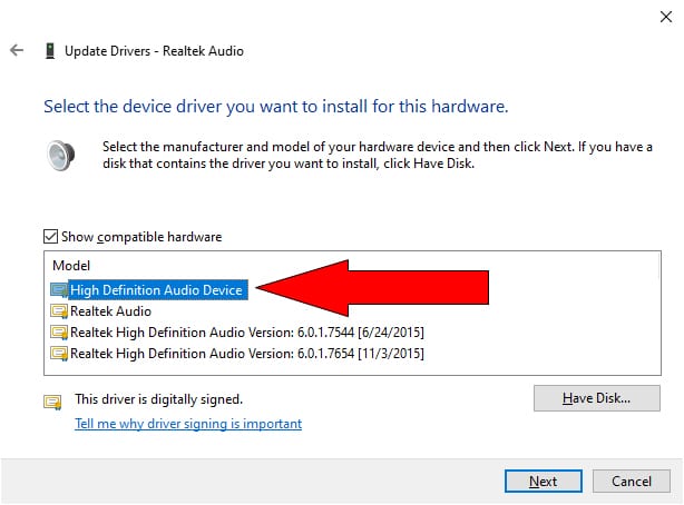 - On the next screen, select High Definition Audio Device and click Next.