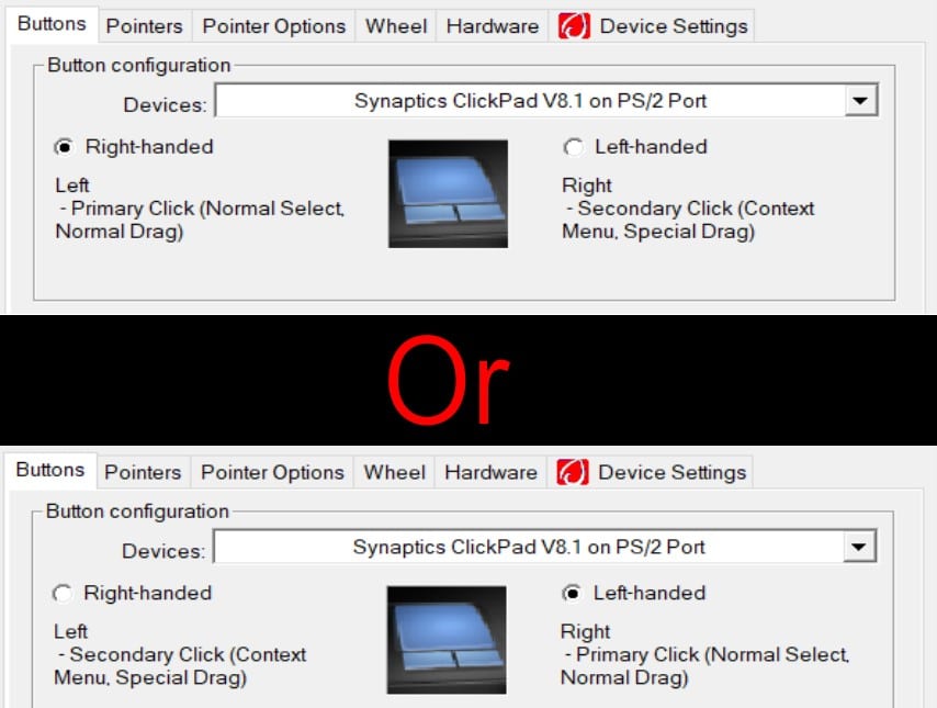 Note the difference in context and primary clicks between right and left-handed mouse configurations.