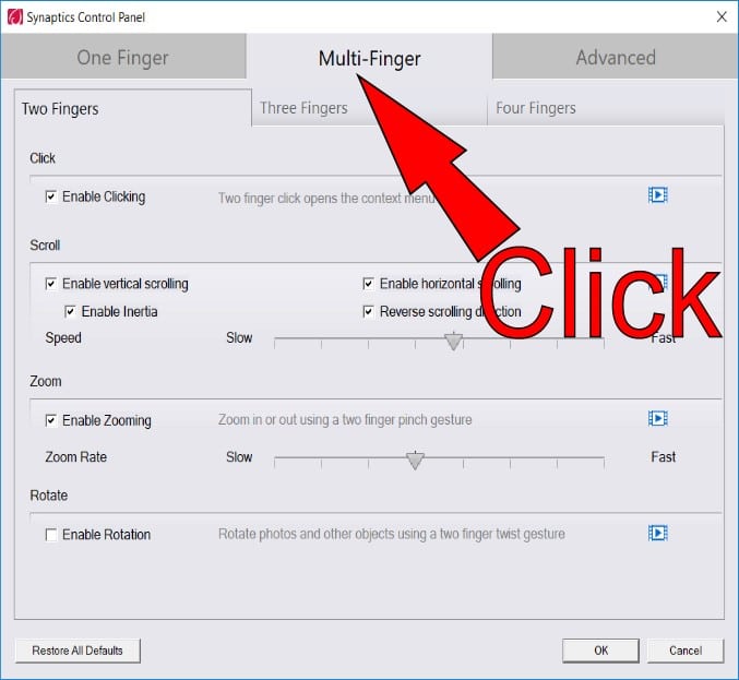 Select the Multi-finger tab to change Gesture Settings.