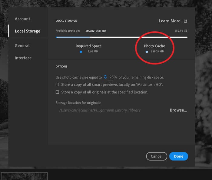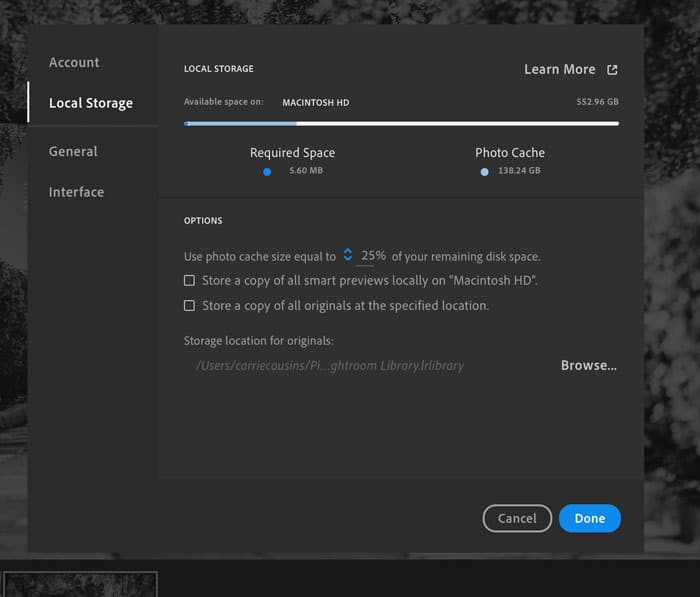 Lightroom CC automatically manages space reserved for storing original images and smart previews, but if space becomes limited you might need more storage. Check the amount of space in the photo cache in the local storage preferences, located in the Lightroom Menu on a Mac or Edit Menu on a PC.