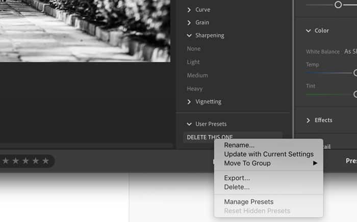 Navigate to the Presets menu, and then right-click on the preset you want to remove and click delete. It is a good habit to remove any third-party tools whenever you experience software issues to see if they are the cause before jumping into more involved troubleshooting methods.
