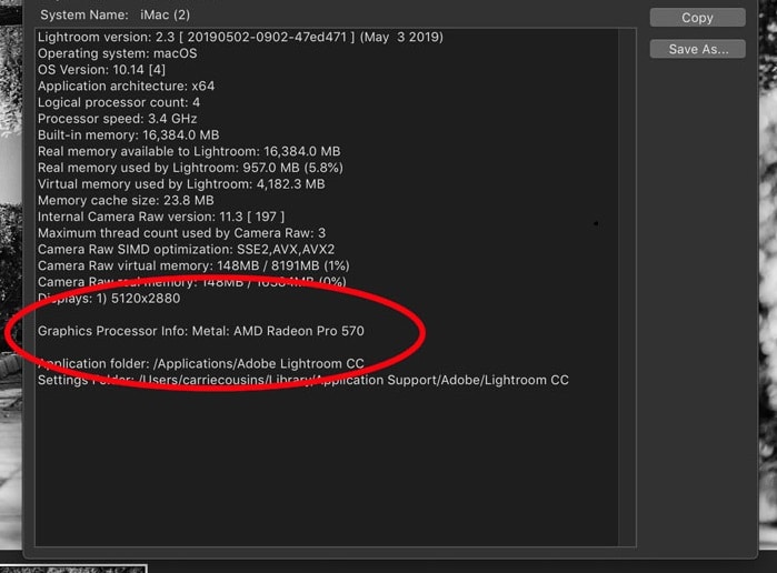Check the processor for compatibility in the general preferences, located in the Lightroom Menu on a Mac or Edit Menu on a PC. Then click System Info to see information for your computer. Graphics card information is near the bottom of the list.