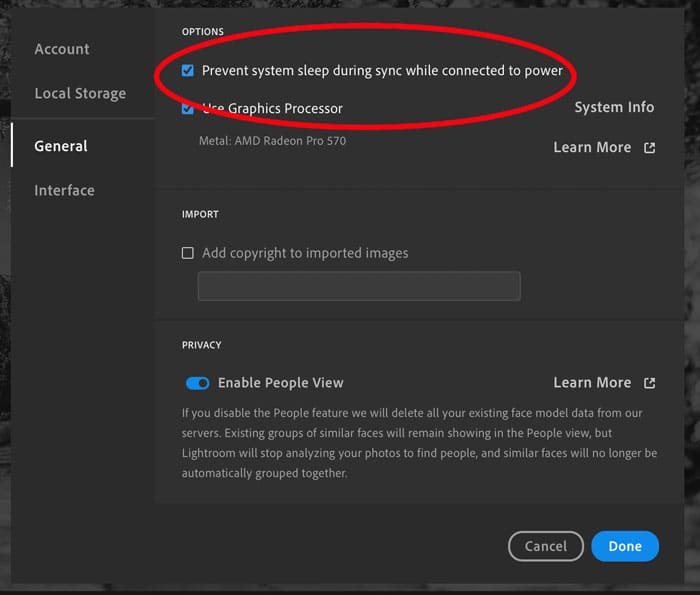 If your computer goes into sleep mode while Lightroom CC is syncing, it can cause problems, including a reduction in speed. Prevent your computer from going to sleep in the general preferences, located in the Lightroom Menu on a Mac or Edit Menu on a PC.