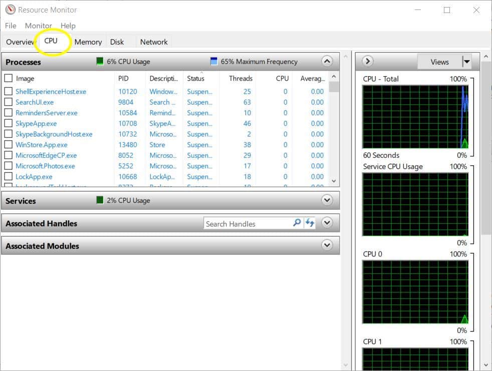 You’ll want to look for processes suddenly appearing and spiking the CPU. In Windows 10, you can use the taskbar’s search to find the Resource monitor and bring it up. From here, you can check what processes are running and how much CPU each uses.