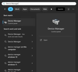 1. Access Device Manager: Click on the Start menu and type ‘Device Manager’ in the search field. Select the Device Manager application from the search results to open it.