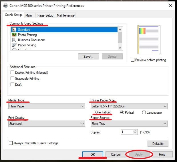 Here you will find several default settings for your Canon printer, which you will alter according to the documents you’re trying to print. If the settings don’t match the dimensions or type of paper you’re trying to print out, you may get an error code.