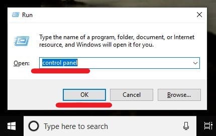 - Type in “control panel” in the bar and hit “OK”: Leave a space between the two words and don’t include quotes.