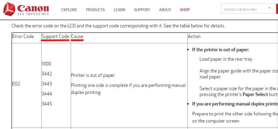 - Find the support code of the error you’re getting. The error code should be listed in the manual.