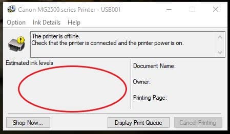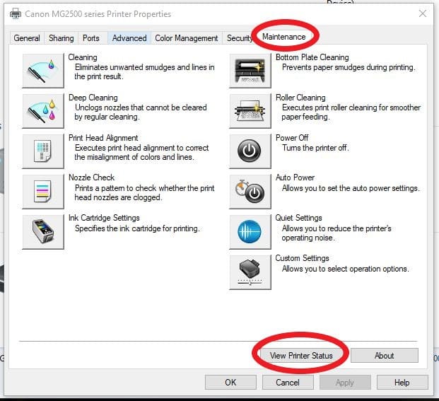 Click on the “Maintenance” tab and then click on “View Printer Status”: This will bring up a small box on the right-hand side of your screen that shows your printer ink levels. Our example is currently offline, so the ink levels are not displayed. Otherwise, other information here would display the ink level.