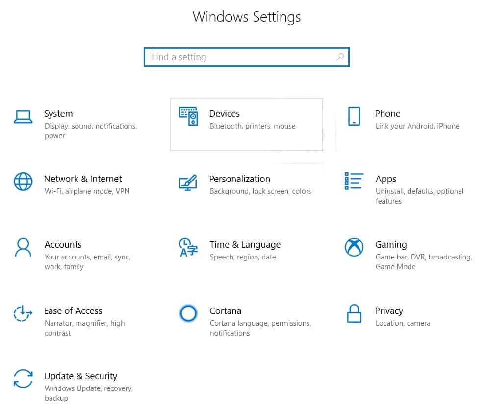 First, you need to pull up your Settings app and click on the “Devices” option from there. This is where you will find information about your printer and its properties, as well as a few other devices like your mouse and touchpad.