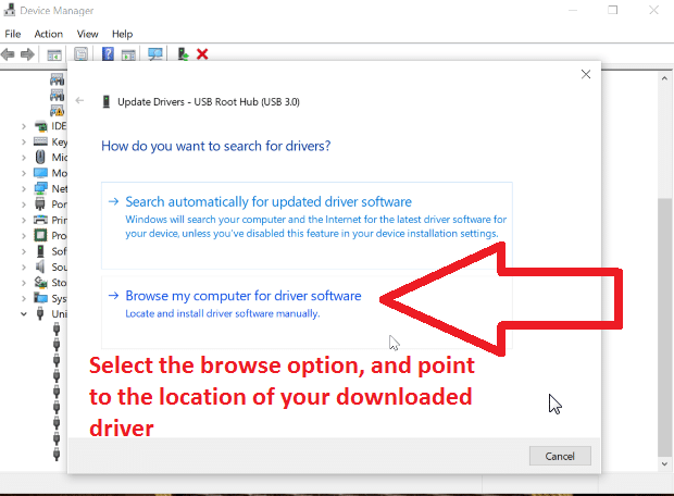 Windows will ask you whether you want to search the internet for the appropriate driver, or if you want to install the driver from a known location on your computer. Since you know the name of the driver you downloaded, and where you saved it, take the option to browse your computer, then point the install to the driver file you downloaded.