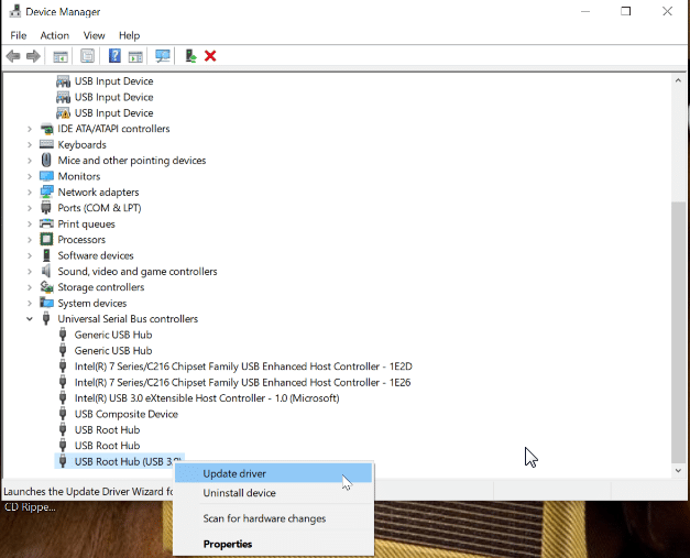 The expanded list will appear. Select the USB port that your external drive is connected to, then right-click, and choose the option to “Update Driver”