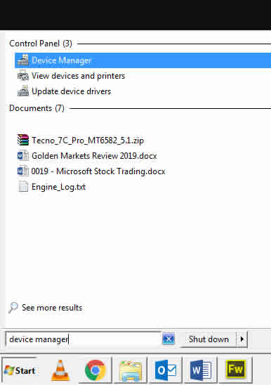 Press the Windows Key on your keyboard or click on the Start button. Type “Device Manager” in the Windows search box below the app menu. Device Manager will auto-fill the results. Click it to open.