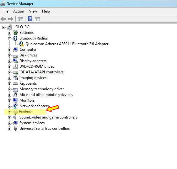 Once the Device Manager window is open, you will find a list of device types. Scroll to the Printers section and click on the (+) sign to expand this section and see the name of your printer.