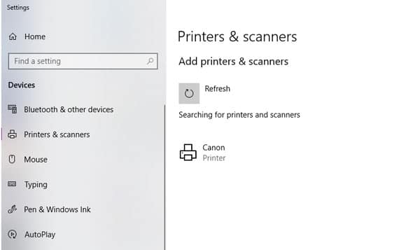 If the printer is still not connecting, make sure the printer is connected to the computer using the Printers & Scanners settings on your PC. Search for Printers & Scanners from the start menu and look for your Canon printer in the list.