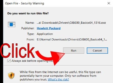 The installer will first require accepting a security warning before launching. This is because the files you’re installing were downloaded from the internet. If you are running the installer from a disc provided with the printer, this message should not appear.