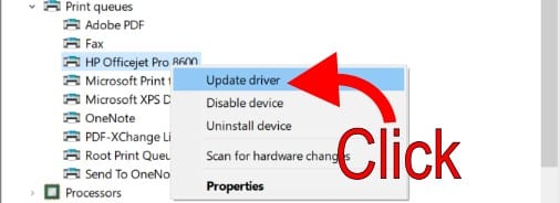 If the HP printer is available in the list, but still does not process a print job, (i.e. the print job is added to the queue or spool, but not actually printing) you can choose to update the driver from the Device Manager.