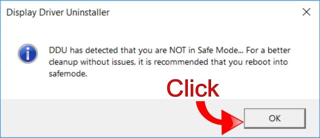 - You’ll see another prompt asking you to reboot in Safe Mode before running the DDU software cleaner. Although it’s recommended, many users report experiencing no issues with using the product in Normal Mode.