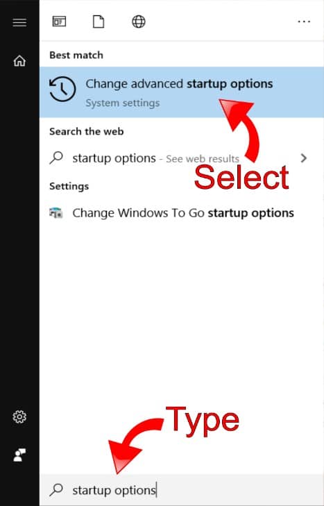 - Now hit the Windows Key and type Startup Options, then select the Change Advanced Startup Options. If you want to skip this and continue running Windows in Normal Mode, go to the Running DDU to Remove NVIDIA Drivers section.