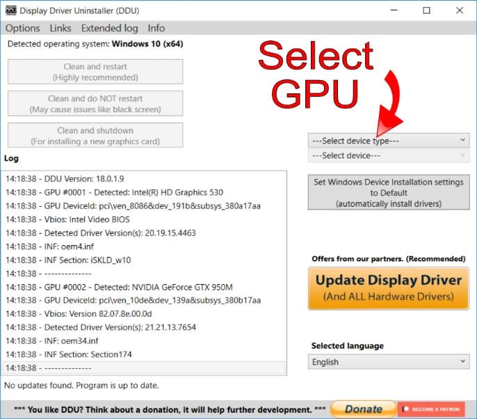 - To remove the NVIDIA display drivers, select GPU from the Device Type dropdown list.