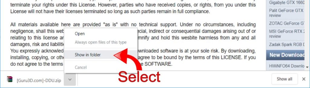 - Once the download completes, locate the file on your PC by clicking on the Up arrow next to the file and selecting Show in Folder.