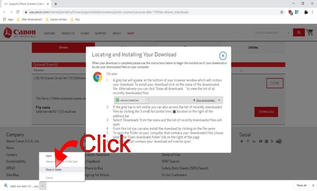 - If you’re using the Chrome browser, you can find your software download by clicking on the up arrow at the bottom of the browser and selecting “Show in folder”.