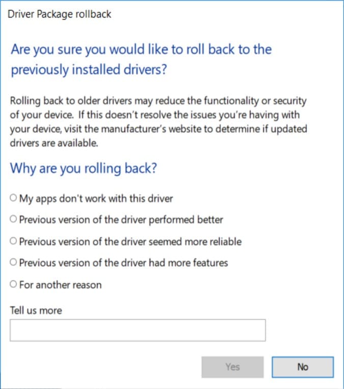 - Windows will request that you provide a reason why you’re rolling back the driver. This is to track issues with drivers and provide a better service to other users in the future.