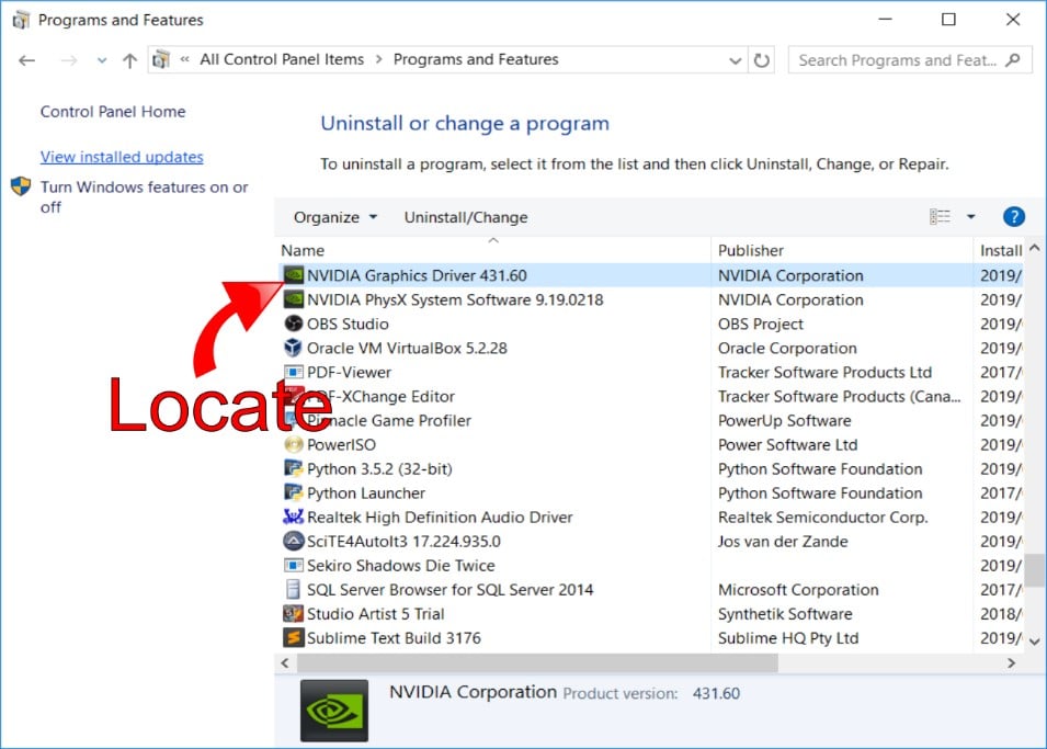 - Scroll down in Programs and Features until you find the NVIDIA Graphics Driver software.