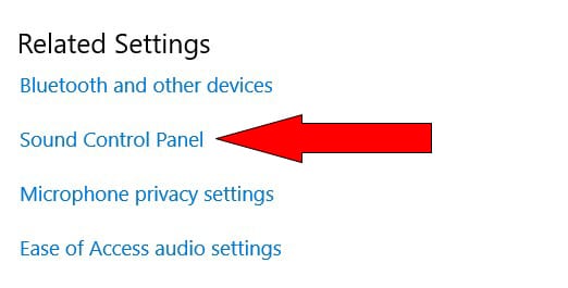 - This opens the Settings window with System page and Sound tab displayed. Scroll down to the Related Settings section and click Sound Control Panel.