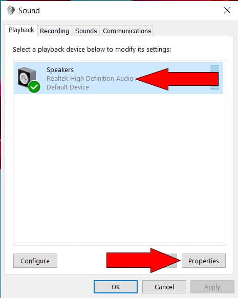 - This opens the Sound dialog box. Make sure the Playback tab is selected, then select the Realtek High Definition Audio device and click Properties. This opens the Speakers Properties dialog box.