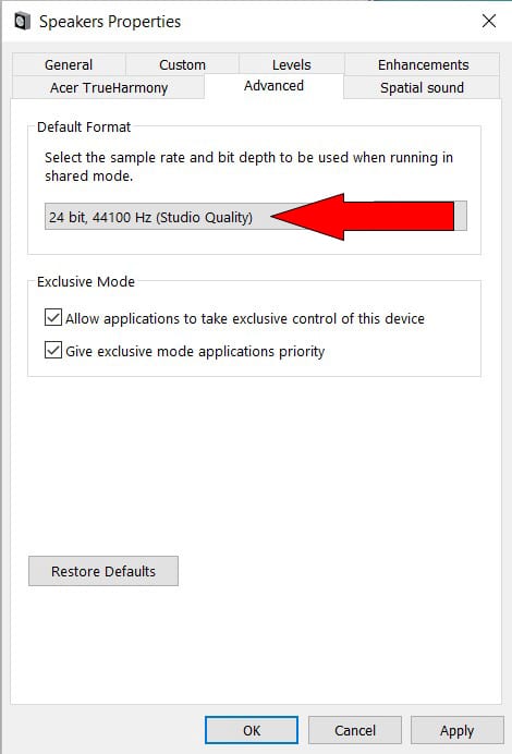 - From within the Speakers Properties dialog box, select the Advanced