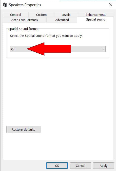 - Pull down the Spatial sound format list and select Off.