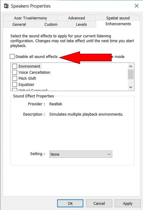 - From within the Speakers Properties dialog box, select the Enhancements