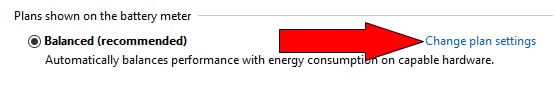 - This opens the Power Options control panel. Click Change plan settings next to the Balanced