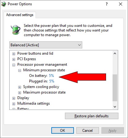 - This displays the Power Options dialog box. Scroll to and expand the Processor power management