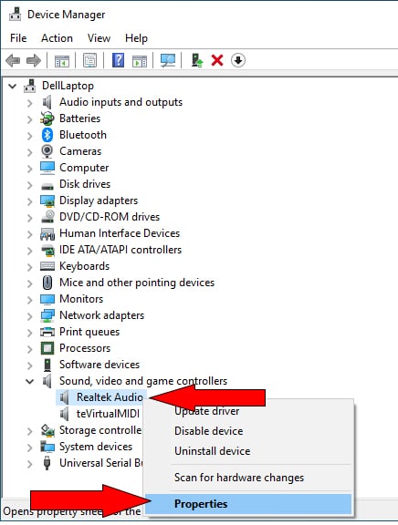 - Double-click to expand the Sound, video and game controllers section, then right-click the Realtek Audio driver and select Properties.