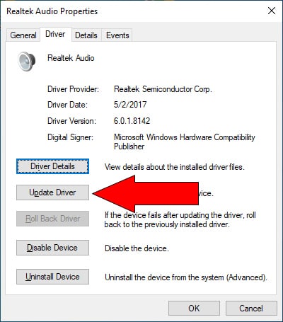 If that doesn’t work, you can try updating the driver to a newer version, if available. Follow the same steps but from the Realtek Audio Properties dialog box, click Update Driver. Windows will search for a newer version of the driver and, if it exists, install it. If Windows can’t find a new version, go to Realtek’s website and download it from there.
