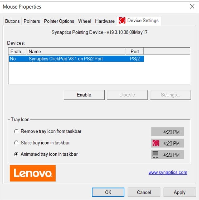 From this screen, you can see the touchpad status such as enabled or disabled. You can also see the current Synaptics version and the device’s port assignment. Keep in mind that this is not your USB mouse settings. However, some changes (such as modifying the scheme settings on the Buttons tab) will change both the touchpad and USB mouse settings.
