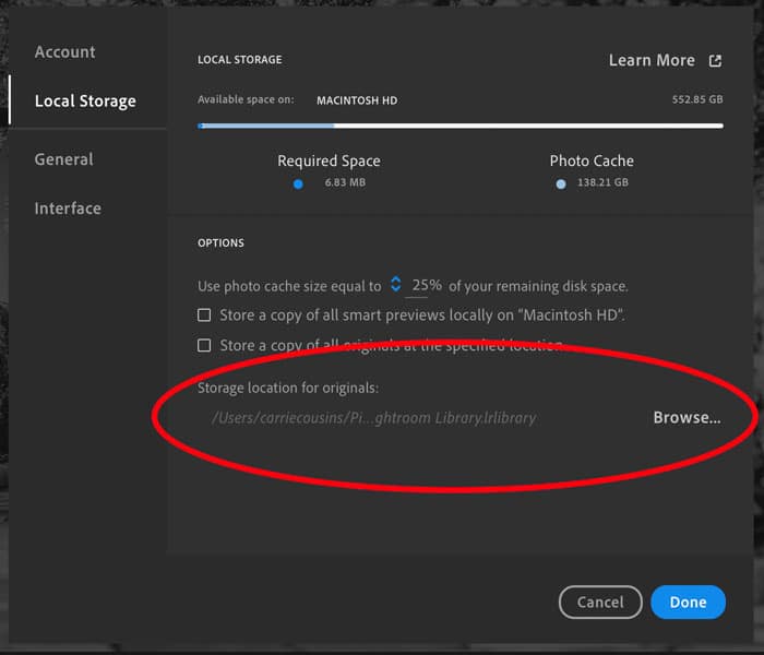 Select the location with the most storage to complete this operation, located in the Lightroom Menu on a Mac or Edit Menu on a PC. Select Local Storage, then browse to find an appropriate storage location for original files. Choose a location with the most disk space available.
