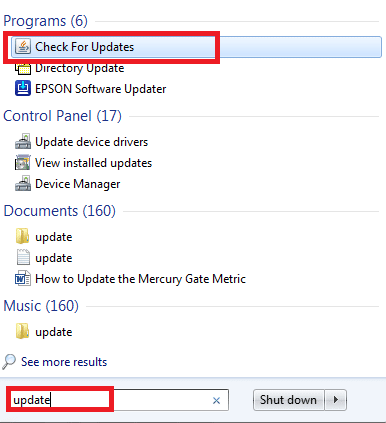 Windows Update is started by simply clicking the “start” button and keying the word “update” in the search window. Just click the “check for updates” option and follow the prompts to download and install updates.