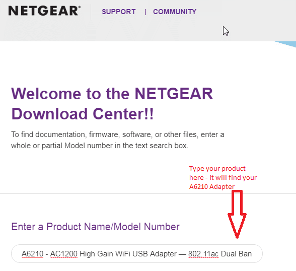 One sure method of getting the most up to date driver for your adapter A6210 is through searching the manufacturer’s website for driver support. Netgear provides a search window for you to start typing the model or device you need help with. Typing A6210 will quickly identify the A6210 adapter: