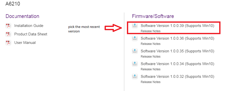 In the case of your A6210 adapter, the version designation with the highest number will indicate that this is the newest release, which you should select from the list. Clicking that software option will initiate the software download, which will begin immediately. You can monitor the download status and see the downloaded file in the gray download of your Chrome browser, or view a similar display in Internet Explorer.